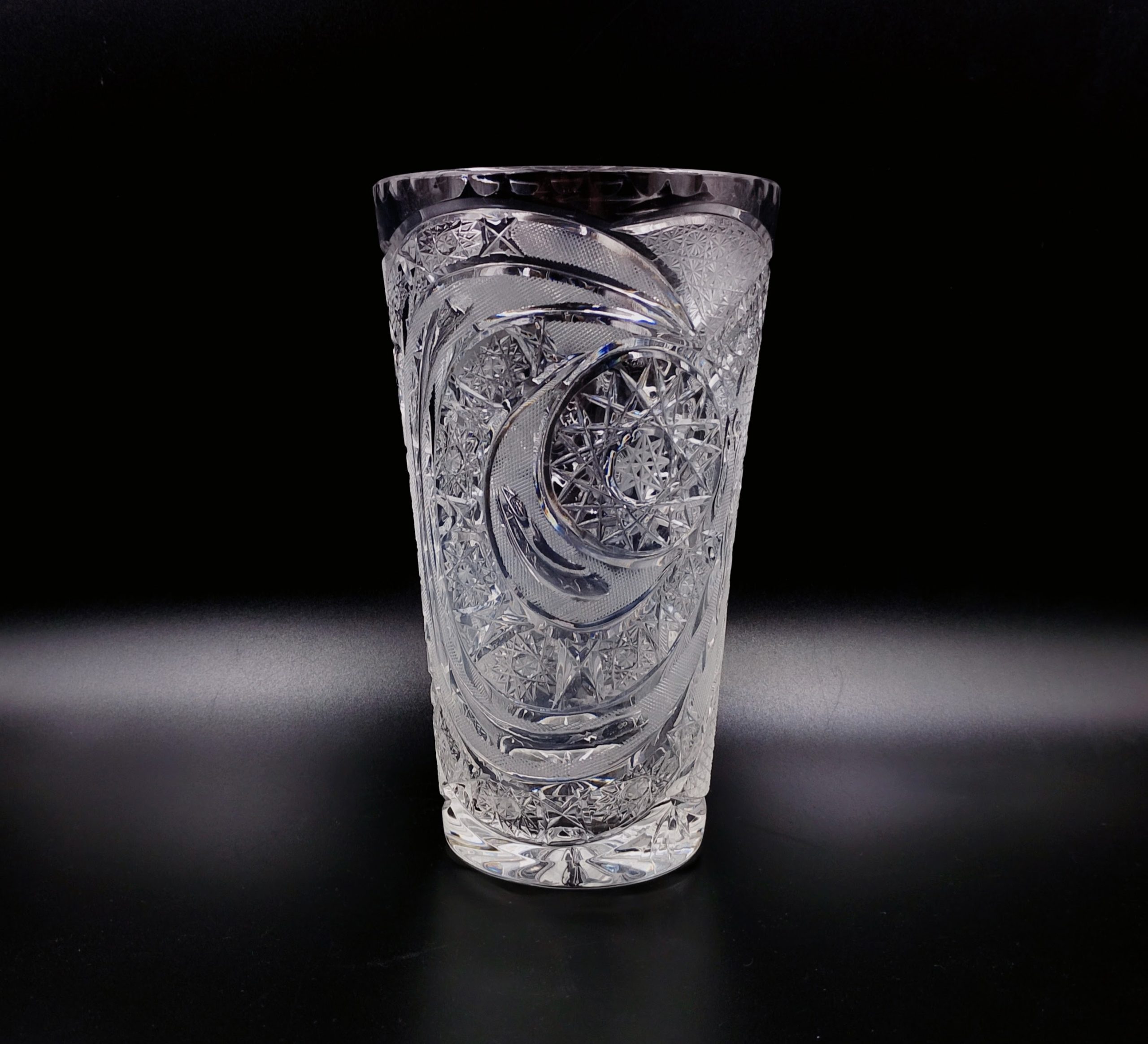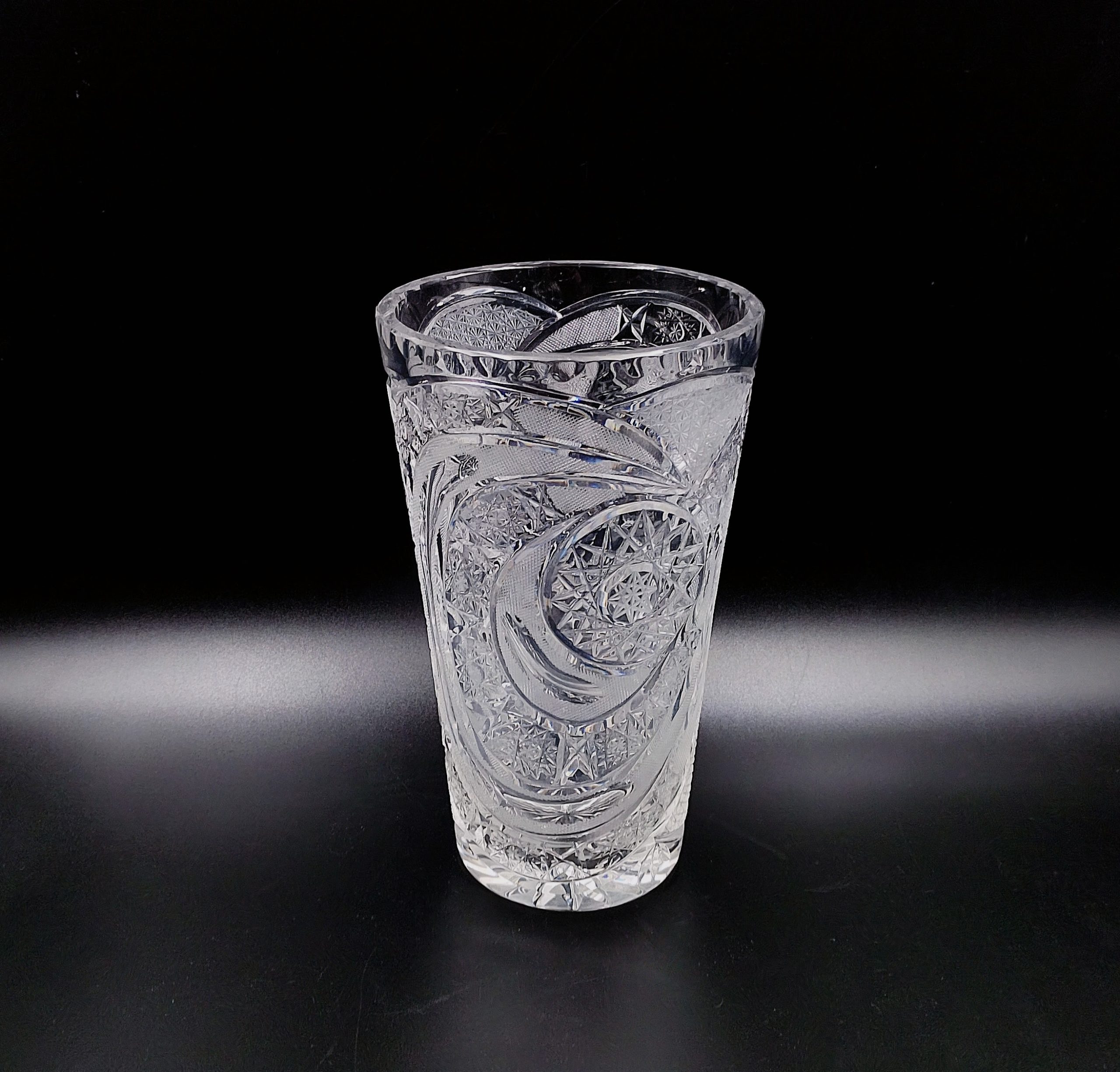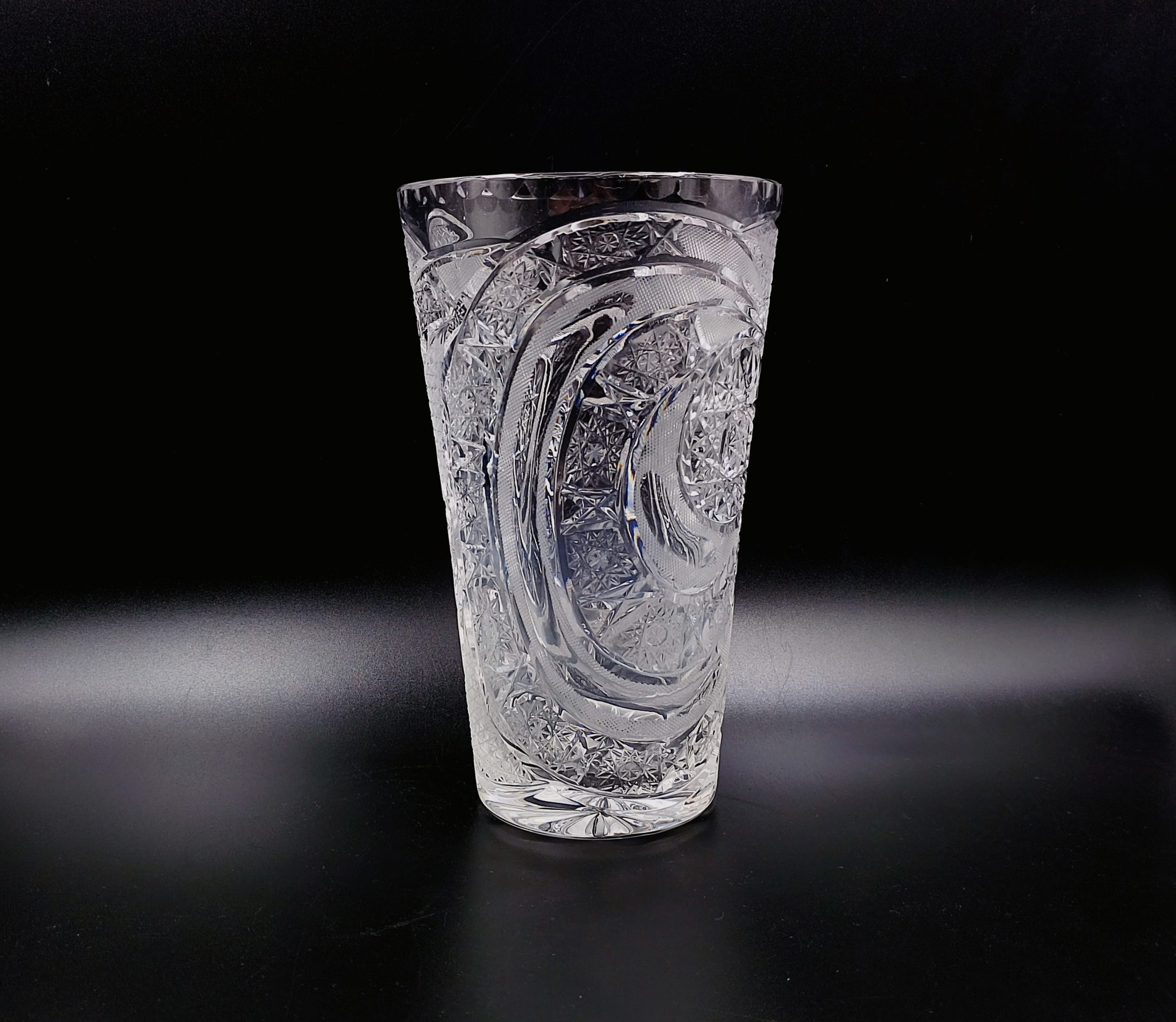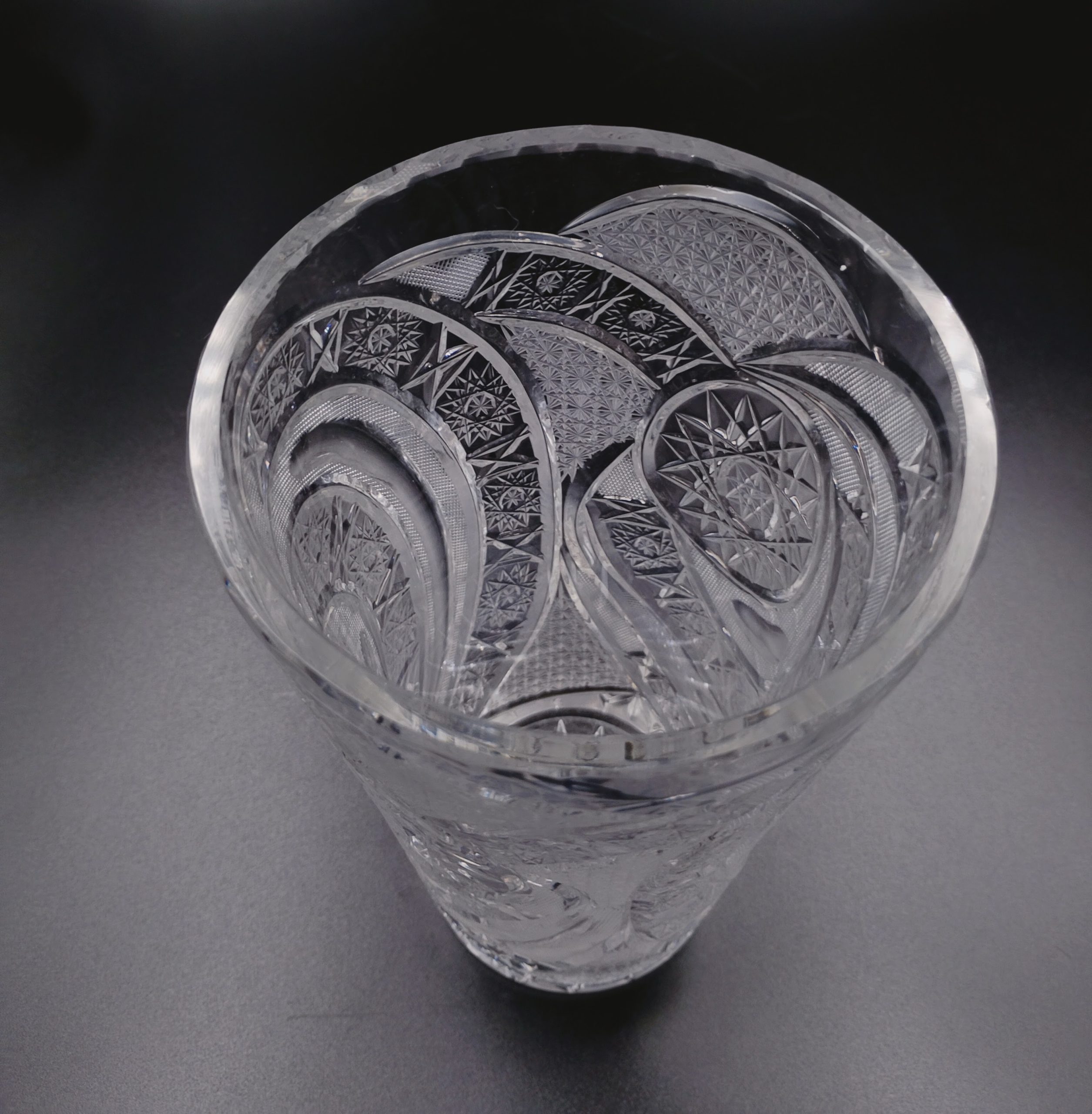 Wazon kryształowy w formie rozszerzającego się ku górze ściętego stożka. Formowany i szlifowany ręcznie w bardzo gęsto usieciowane wzory z licznymi szesnastoramiennymi gwiazdami, zdobienie naprzemiennie wykończone na wysoki połysk i wykończone satynowo, co stanowi świetny kontrast, dzięki któremy wzory są dobrze widoczne. Dzięki zastosowaniu skomplikowanego szlifu kryształ przepięknie rozszczepia i załamuje światło. Wlew ozdobiony obwodowo drobnymi wklęsłymi fasetkami przypominającymi łuskę.