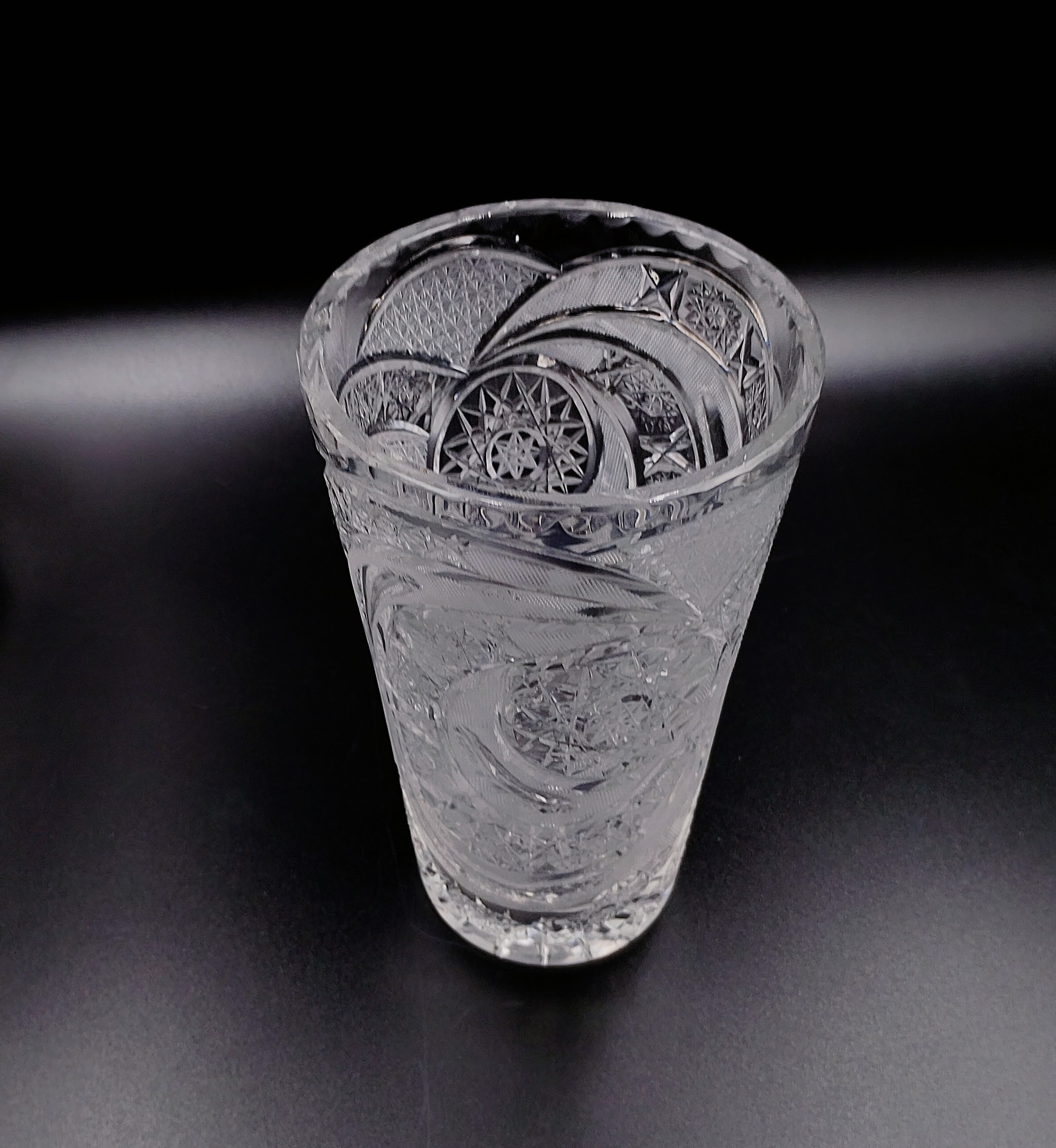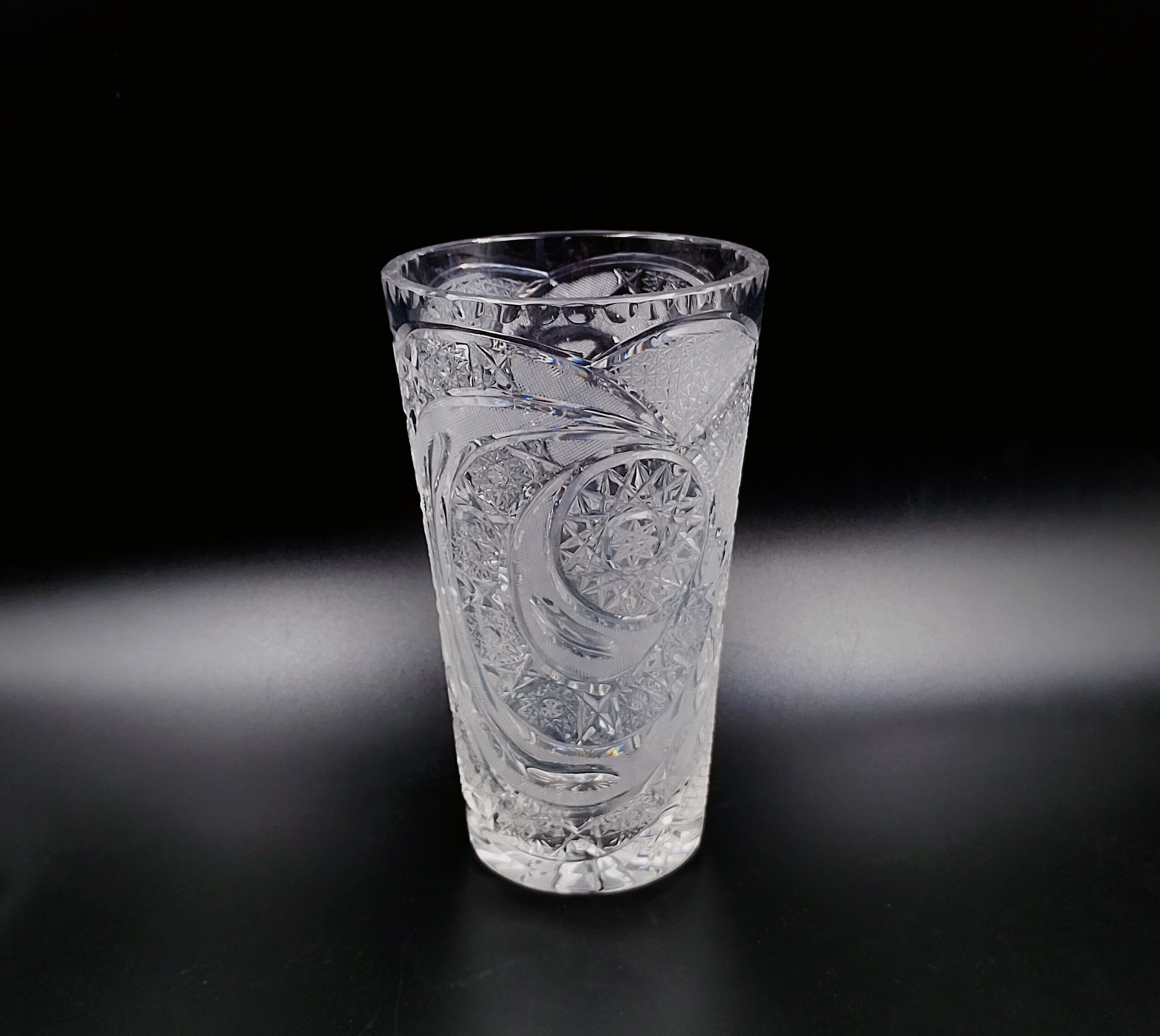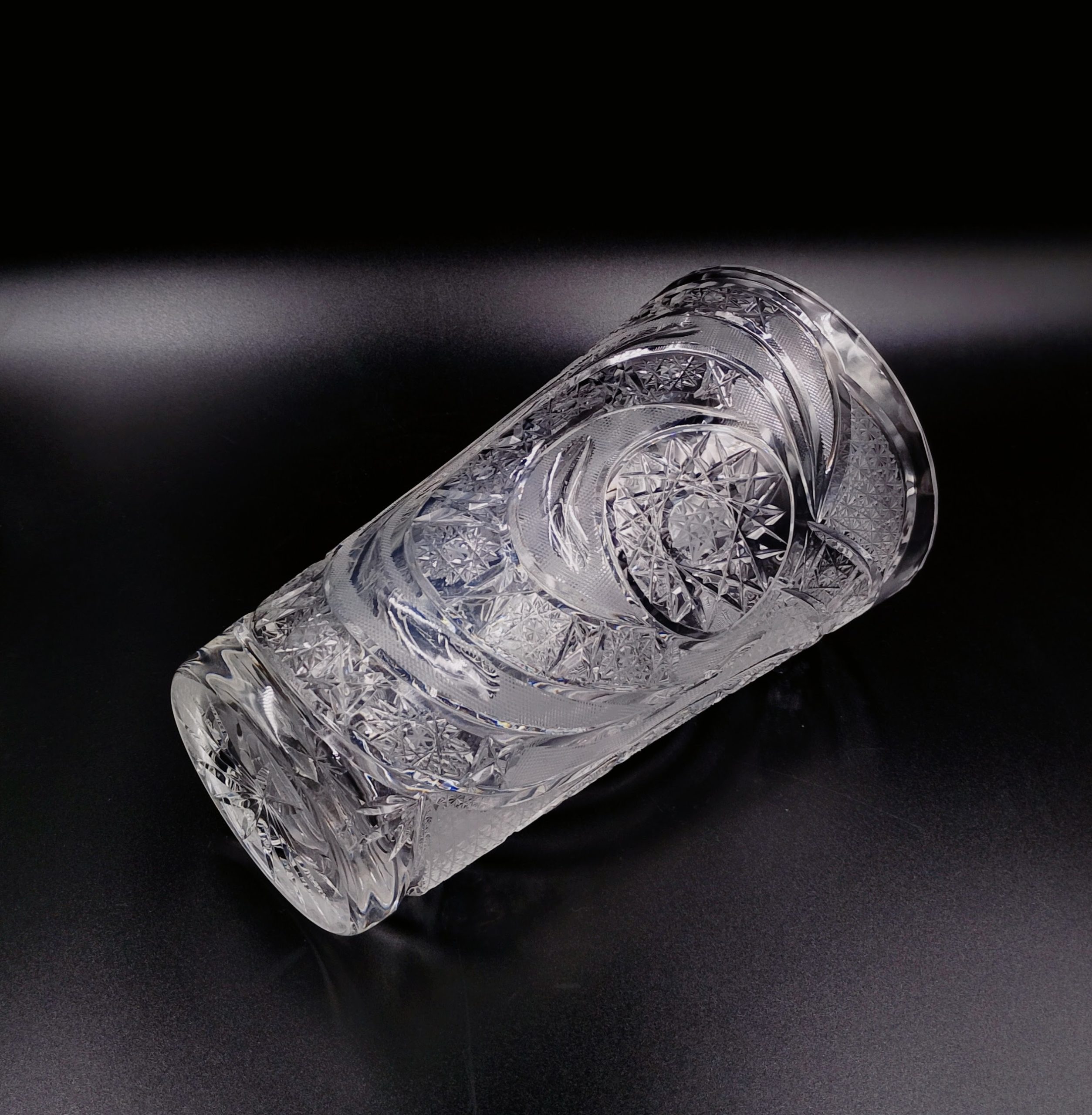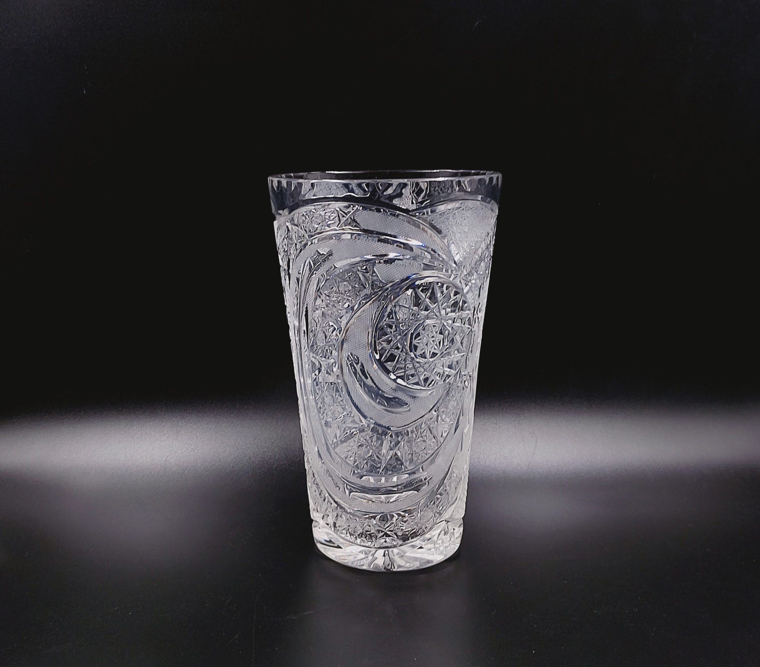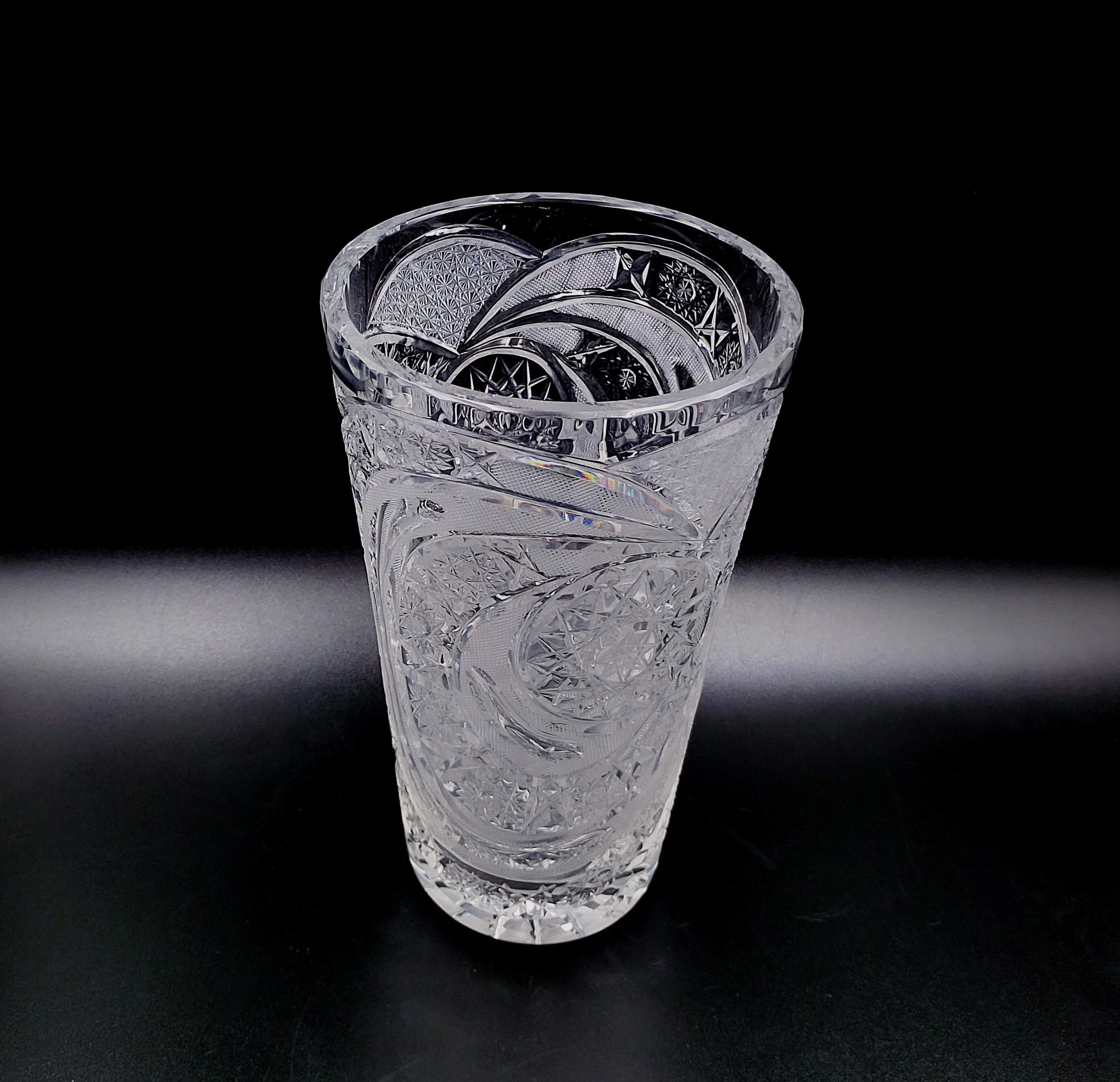 Wazon kryształowy w formie rozszerzającego się ku górze ściętego stożka. Formowany i szlifowany ręcznie w bardzo gęsto usieciowane wzory z licznymi szesnastoramiennymi gwiazdami, zdobienie naprzemiennie wykończone na wysoki połysk i wykończone satynowo, co stanowi świetny kontrast, dzięki któremy wzory są dobrze widoczne. Dzięki zastosowaniu skomplikowanego szlifu kryształ przepięknie rozszczepia i załamuje światło. Wlew ozdobiony obwodowo drobnymi wklęsłymi fasetkami przypominającymi łuskę.